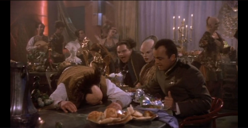 3) Kunnianhimo yltää kaikkeen muuhunkin. Vaikka tietty halpuus näkyykin varsinkin nykysilmin, sitä osataan kiertää hienosti. Hyvällä äänisuunnittelulla, kuvauksella ja leikkauksilla luodaan illuusio ruuhkaisesta ja vilkkaasta avaruusasemasta. Ei tarvita massiivista budjettia, kun apuna on elokuvan taika. Lavasteet ovat parhaimmillaan yllättävän kiinnostavia ja yksityiskohtaisia, puvustus samoin. Maskeeraus jaksaa yllättää yhäkin, koska niissä on riittämiin eloa ja joustoa, jotta näyttelijöiden mikroilmeetkin välittyvät. Erityisesti melkoisen maskin alta näyttelevän Andreas Katsulaksen ilmeikkyys jaksaa ällistyttää yhäkin. Miten hitossa niillä oli tähän kaikkeen aikaa ja varaa?!