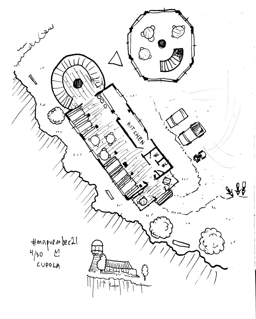 ”Cupola”:n merkitys piti googlesta tarkistaa. Ensin ajattelin tehdä kuvahaun mukaisen avaruusnäköalakupolin, mutta huomasinkin idean toimivan myös maan päällä. Niinpä lähdin ensin piirtämään kupolimaista näköalatornia, johon nopeasti liitinkin vielä kahvilan.