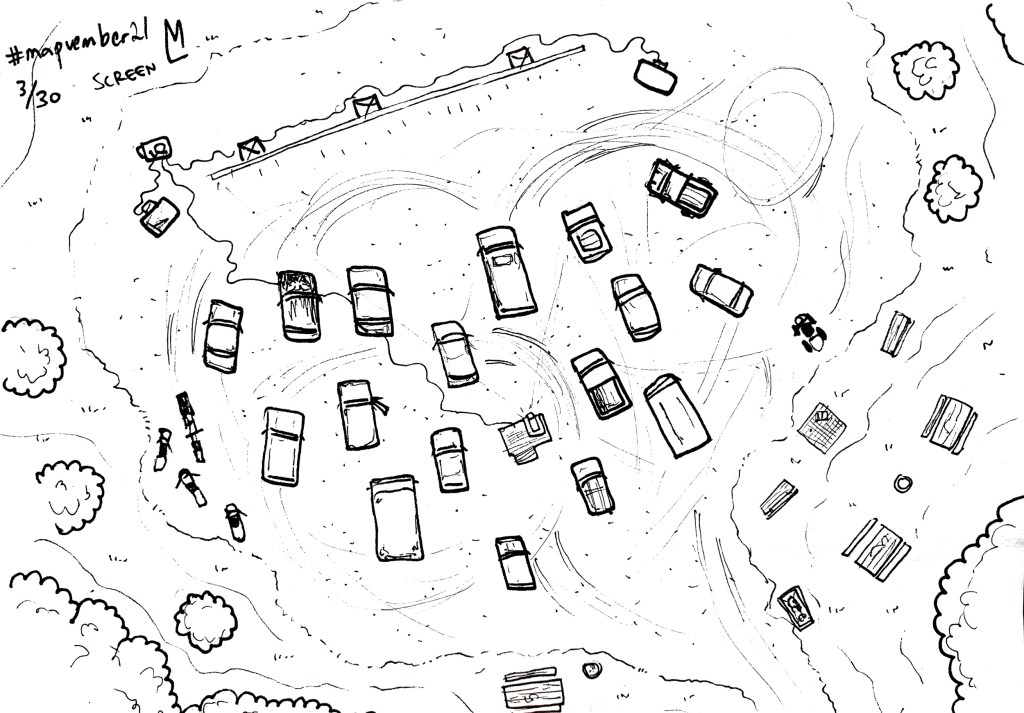 Ensimmäinen kartta alkoi vähän laiskasti ja vielä ennakkoon. Puolen vuoden kartanpiirtelytauko ei tehnyt hyvää. Kartta ei välttämättä ole mitenkään erityisen mielenkiintoinen, mutta jäin silti itse pohtimaan, että jotain mielenkiintoistahan tuossa lokaatiossa on tapahduttava, kun kerran karttakin siitä on.