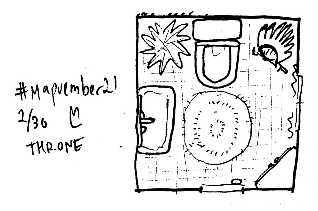 Alkukankeus oli jo voitettu ja innostuin ajatuksesta ”pakottaa” kaikki karttapromptit Syntien maailmaan. Välittömästi kakkospäivä löi kuitenkin märällä rätillä ja lähtökohtana oli ”valtaistuin”. Miten tämän nyt sijoittaisi 1990-luvulle?