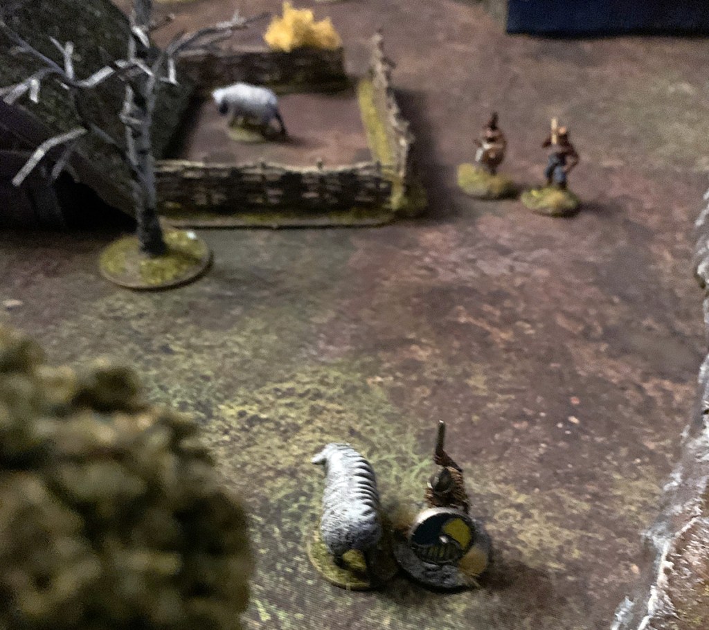 Tämän skenaarion tarkoituksena oli ryöstää taloja ja orjia. Olin kuitenkin asettanut aitaukseen kaksi lammasta rekvisiitaksi. Molemmat ryöstelijät olivat kuitenkin sitä mieltä, että tottahan lampaiden ryöstäminen lasketaan pisteiksi myös!