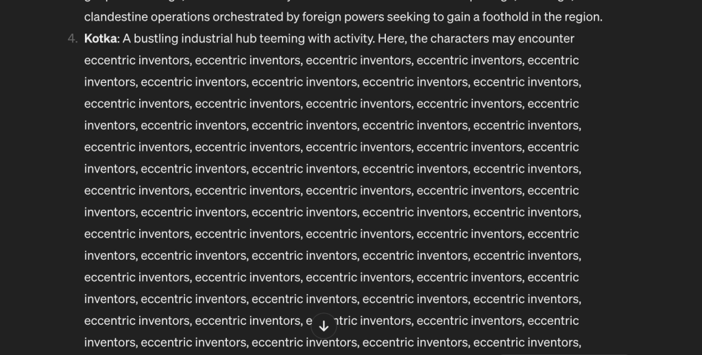AI ei oikeasti osaa luoda mitään, vaan yhdistelee ajatuksia siten, miten se laskee minun toivovan vastauksen muotoutuvan. ”Cthulhu” muutti heti keskustelun maanläheisestä historian tutkimuksesta kultisteihin ja muinaisten herättämiseen. Periaatteessa voin sanoa AI:lle, että unohda nämä asiat, mutta oikeasti se toimii vain harvoin. Jos sitten siirryn vain eteenpäin, niin tiettyjen avainsanojen tuomat promptit AI:lle ovat vain niin vahvoja, että ne saturoivat keskustelua vielä pitkään tilanteen jälkeenkin.
