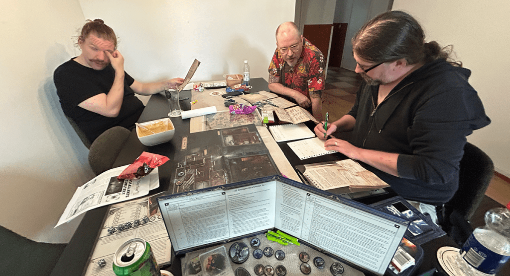 Pelasimme ensimmäisen pelin neljällä ja toisen kolmella pelaajalla. Kummassakaan ryhmässä ei ollut samoja pelaajia. Ensimmäisellä kerralla nautittiin pelin ohessa alkoholia, toisella kerralla ei. Silti kumpikin porukka päätyi seuraamaan samaa johtolankaa, ohittaen muut ihan mitään sanomattomina – ja toki löytäen vinkeistä myös johtolankoja suuntiin joita pelissä ei edes ollut.