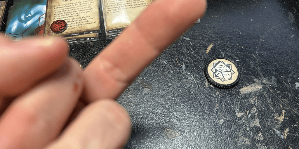 Laskin jo, että pakko lähteä taas karkuun ja ilman kirjaa. Nostopakka veteli viimeisiään, hirviö puski päälle ja doom counterit jotka laskevat seikkailun etenemistä vetelivät viimeisiään. Sitten tajusin houkutella hirviön pois oikeasta salista perääni ja sain sen vartijan avulla pakasta juuri oikean kortin.