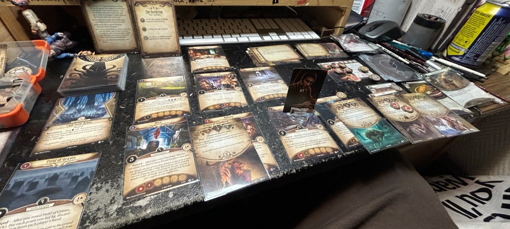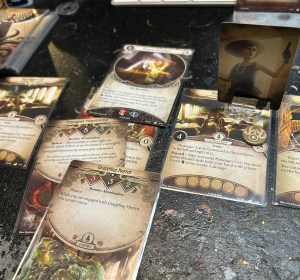 Ostin aikoinaan (ilmeisesti viime vuosikymmenellä…) kaikki AHLCG:n lisärit mitä hyllyyn tuli. Pelailimme jonkin verran kaveriporukalla, mutta lopulta sekin vaan jäi. Nyt roolipelin ja Mansions of Madnessin myötä Arkham-innostus päätyi lopulta siihen, että purin kaikki kesken jääneet pakat ja pelit omiin lootiinsa. En jättänyt edes pelaajalle tarkoitettuja kortteja erikseen, koska halusin ennemmin pikkuhiljaa tutustua hommaan uudelleen kuin musertua massiivisin korttimäärän ääressä.