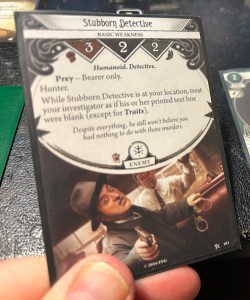 Tähän mennessä yhdellä hahmolla pelaaminen oli ollut mukavan haastavaa ja hahmo (eli pakka) toimi mielestäni hyvin. Dunwich osoitti, miten väärässä olin ollut. Ensin yrittäessäni etsiä kultistien kaappaamia tyyppejä, ryntäilin hädissäni taas sinne tänne. Hyvätkään suunnitelmat eivät auttaneet, kun Barnesin keskitien ominaisuudet tulivat vastaan ja viholliset veivät järjen. En päässyt juuri alkua pidemmälle ja kaverinikin uhrattiin inhoissa riiteissä.